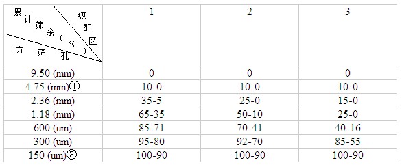 注①:砂的實(shí)際顆粒級配與表中所列數(shù)字相比,除4.75mm 和600μm 篩檔外,可以略有超出,但超出總量應(yīng)小于5%。 |